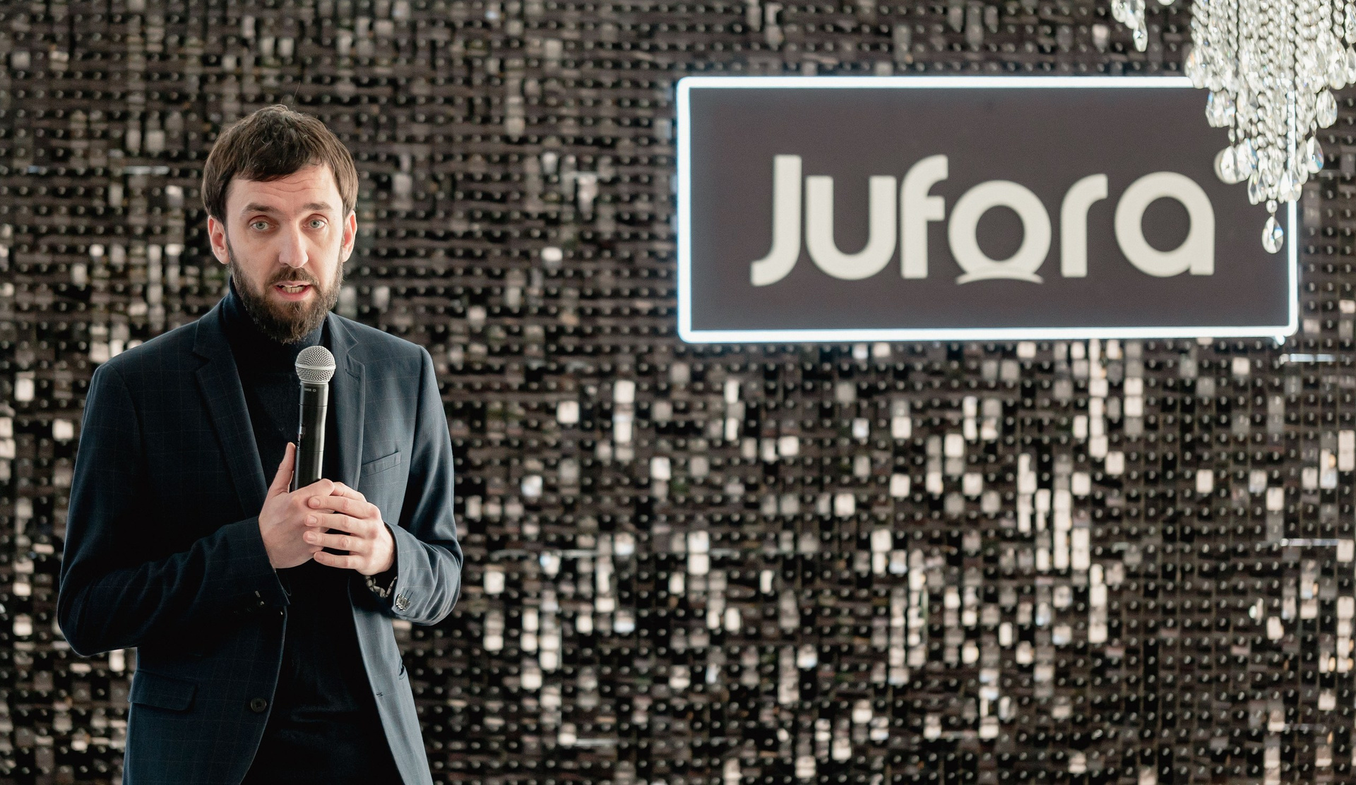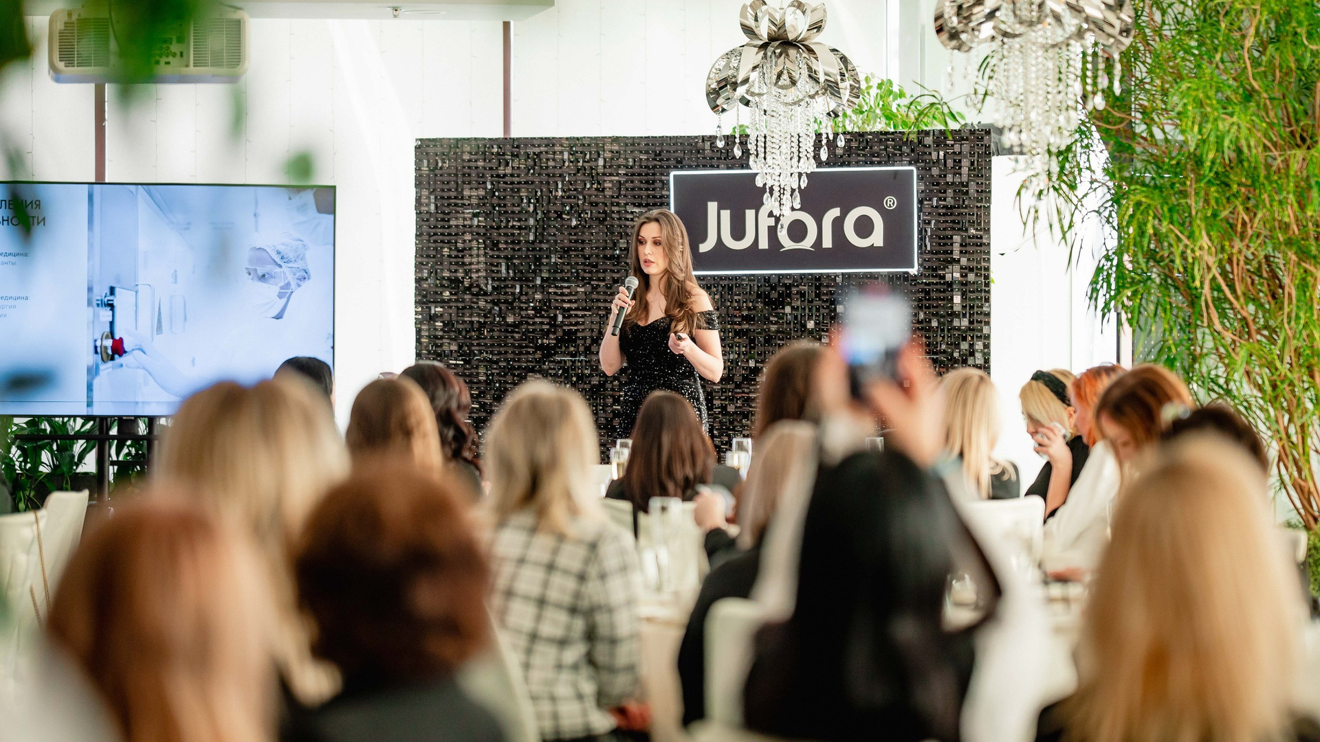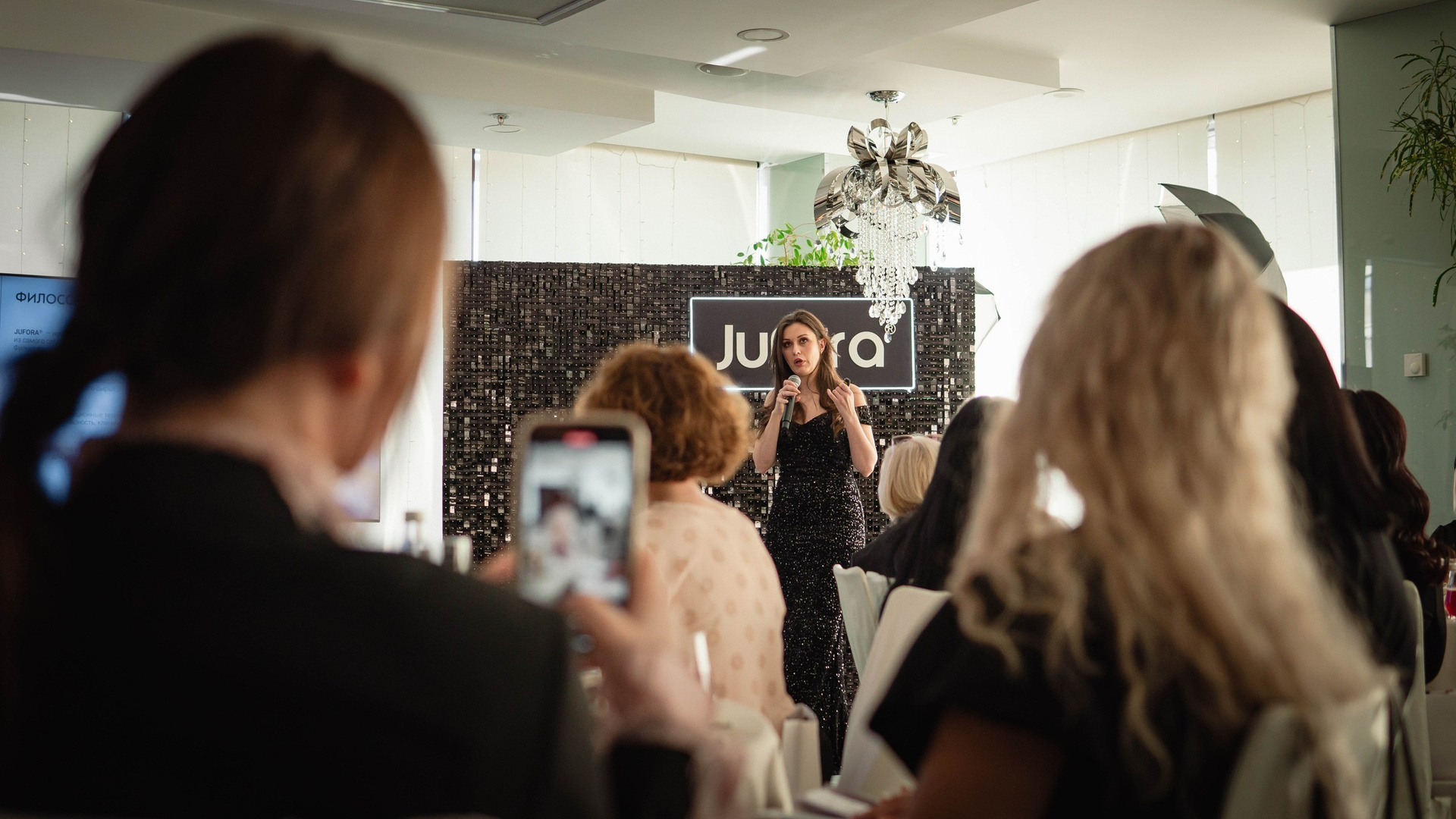 Особого внимания заслуживал декор. Организаторы продумали каждую деталь, чтобы подчеркнуть эстетику jufora®. Центром притяжения стала стильная фотозона: строгая черная стена, полностью выполненная из мерцающих блёсток, с крупным логотипом бренда. Это был смелый и эффектный контраст с общей светлой гаммой зала. Здесь я ловил самые яркие эмоции гостей и спикеров — кадры получались глубокими, фактурными и очень атмосферными.