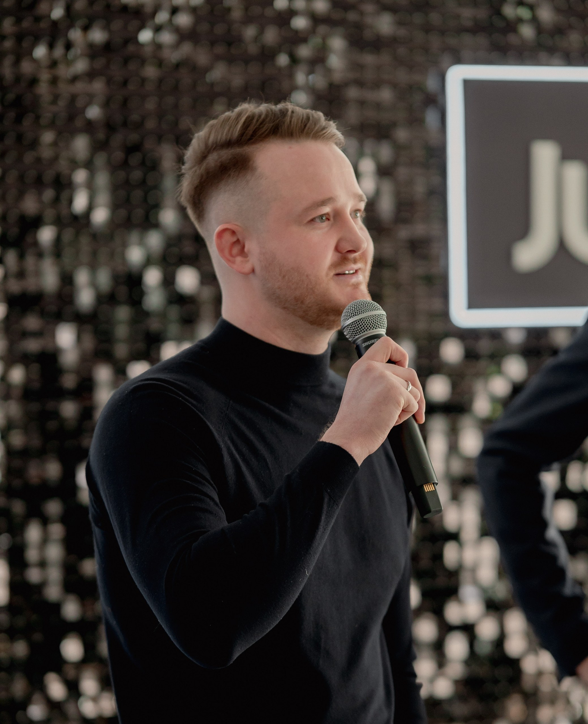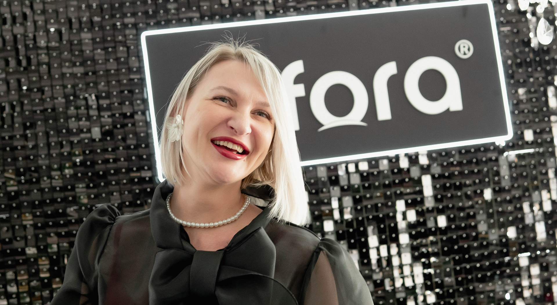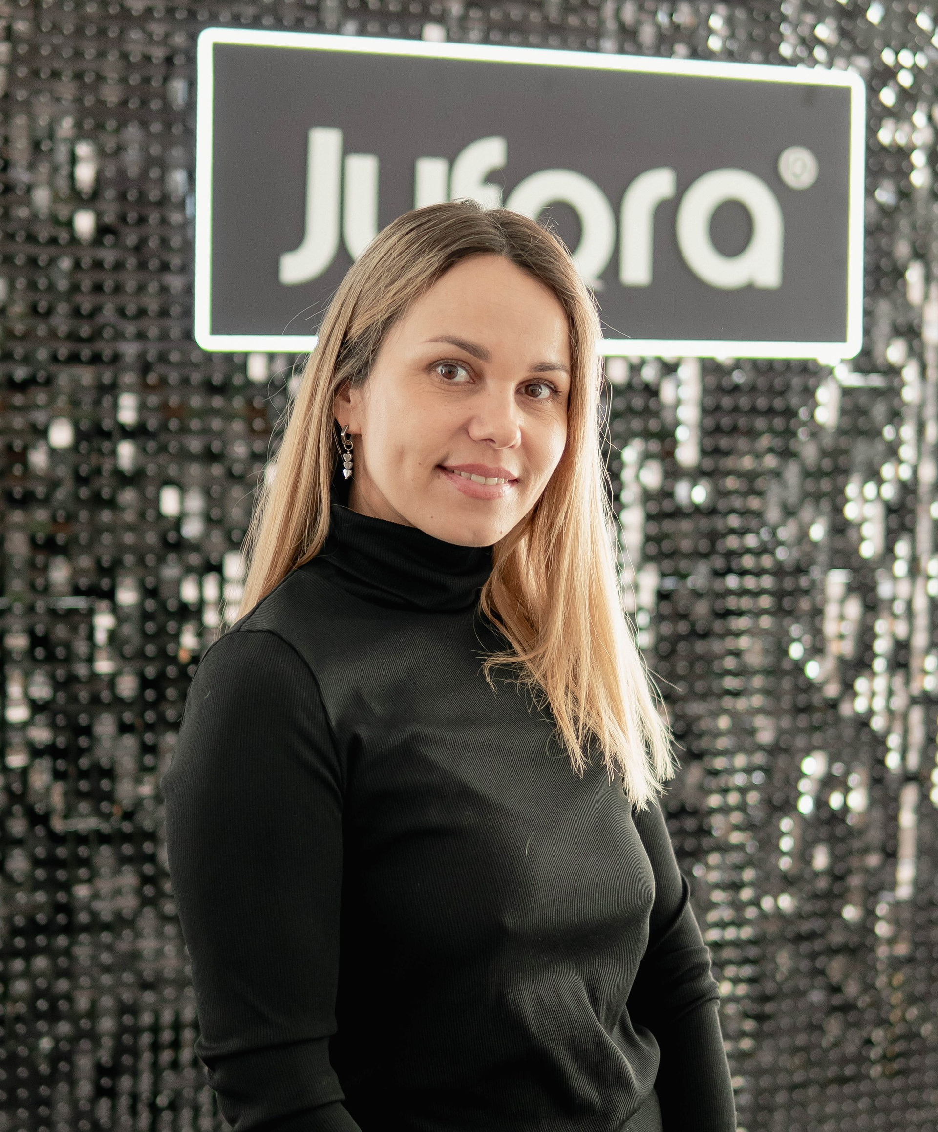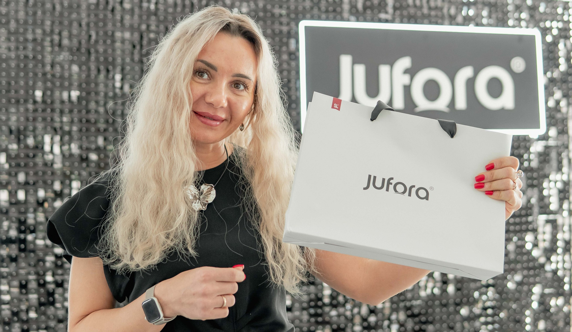 Особого внимания заслуживал декор. Организаторы продумали каждую деталь, чтобы подчеркнуть эстетику jufora®. Центром притяжения стала стильная фотозона: строгая черная стена, полностью выполненная из мерцающих блёсток, с крупным логотипом бренда. Это был смелый и эффектный контраст с общей светлой гаммой зала. Здесь я ловил самые яркие эмоции гостей и спикеров — кадры получались глубокими, фактурными и очень атмосферными.