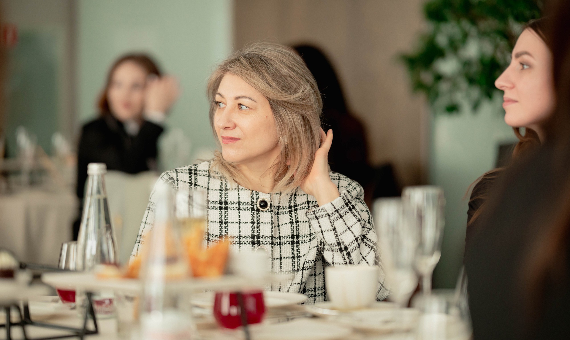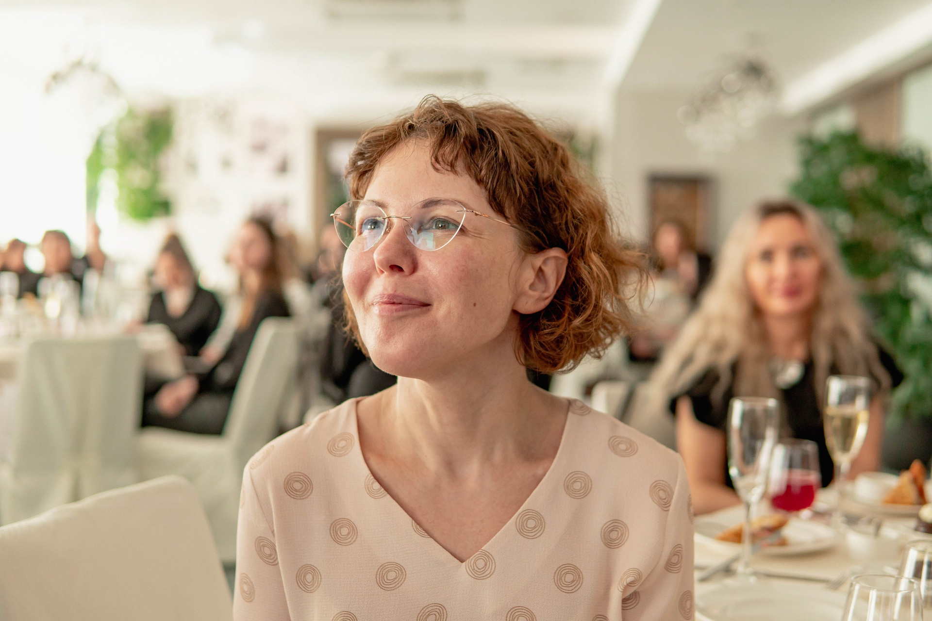 Местом проведения стал уютный банкетный зал отеля Marriott. Нам невероятно повезло с погодой: за большими панорамными окнами светило яркое солнце. В таких интерьерах с высокими потолками и хрустальными люстрами солнечный свет создает неповторимую игру теней и бликов. Белоснежные скатерти на круглых столах работали как естественные отражатели, наполняя кадры светом и делая их по-настоящему воздушными. Такое стечение обстоятельств — это удача для репортажного фотографа!