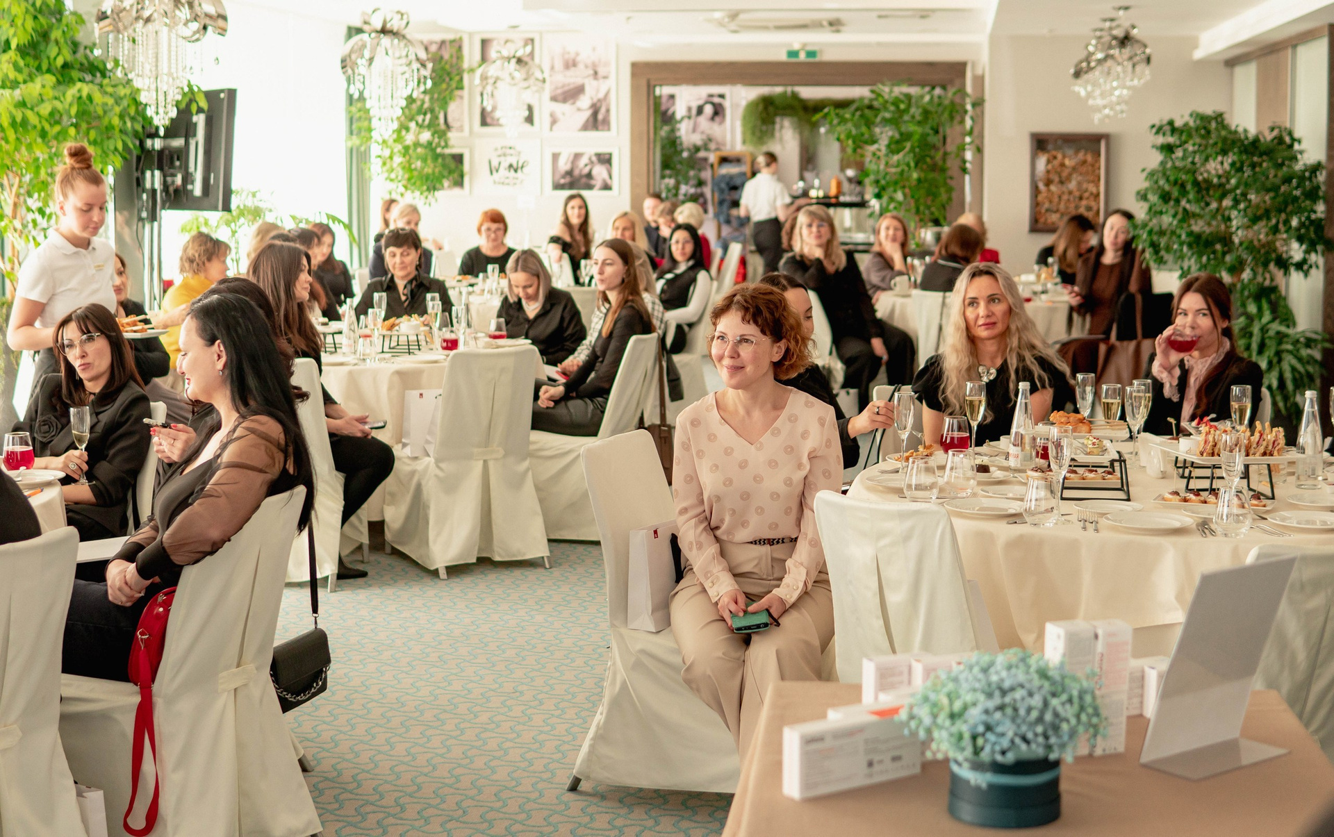 Главными героинями мероприятия стали женщины-косметологи. Профессионалы своего дела, они выглядели потрясающе — каждая с идеальным макияжем и стильным нарядом. Это был тот случай, когда аудитория идеально вписывается в эстетику бренда. Моей задачей было не просто сделать репортажные фото, а показать их красоту, уверенность и тот неподдельный интерес к новинкам jufora®, который читался в глазах.
